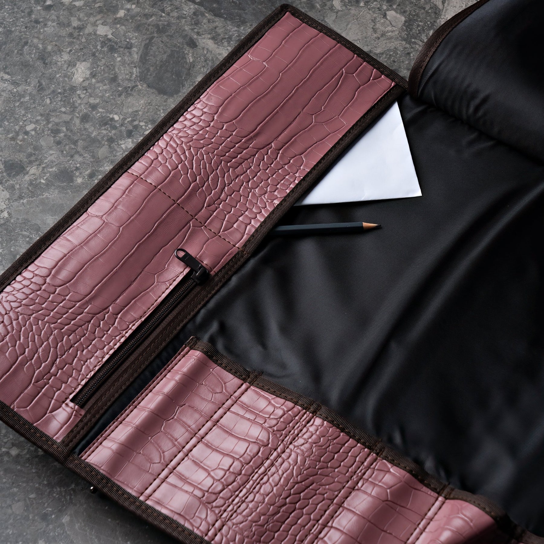 Features 8 knife slots that can accommodate blades up to 16.5 inches in total length. Includes a zippered utility pocket and a side compartment for additional tools or accessories—perfect for your honing rod, tweezers, or pens.