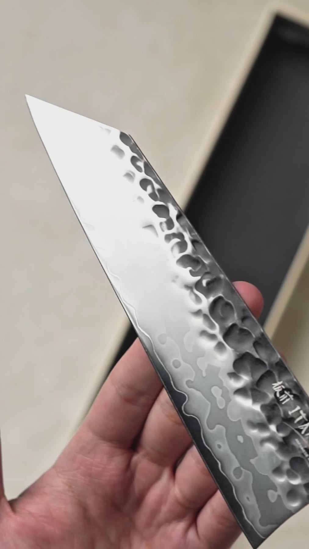Its 2.5 mm-thick blade offers strength, sharpness, and smooth cutting performance that lasts. The hand-hammered finish helps food glide off the blade with ease.